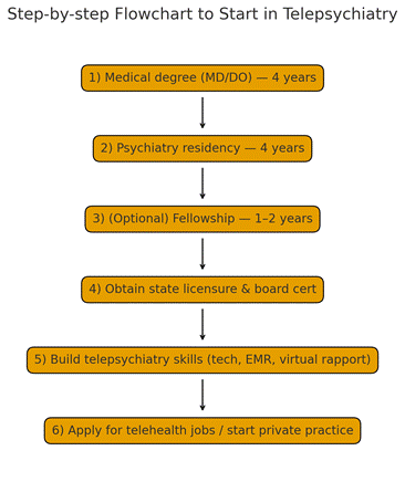 - Becoming a telepsychiatrist requires completing medical school, a psychiatry residency, state licensure, and developing telehealth-specific technical and communication skills.