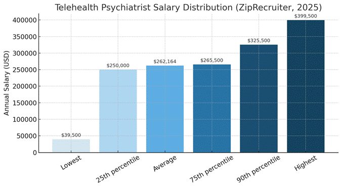 The next top question: how much do telepsychiatrists earn? On average, telepsychiatrists in the U.S. earn about $262,164. But that’s just the middle ground. Many telepsychiatrists, especially those with experience or in specialized areas, earn $300,000+ annually.